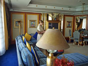 The hotel and the suites are over-the-top. Our room at check-in was on the second floor. They moved us to a similar suite on the 15th floor the next morning. I'm not sure this accommodation should even be called a suite. A "comfortably sized home" would be more like it. Our (for lack of a better word) suite is on two floors, large living room and office on the first floor and bedroom on the second (complete with a mirrors on the ceiling). The interior decoration colors are wild, but understandable if a lot of their clientele are from basically sand-colored places. For example, there's gold on picture frames and the multiple TVs, plus red and sapphire/navy colored sofas and chairs, with accents of floral and geometric fabrics that have blasts of yellow, purple, etc.