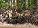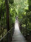 We were treated to a picnic in the rainforest and then went on a river-ride through a mangrove swamp looking for crocodiles. Again, wind and rain made the trip rough but we did manage to see several small crocs and one about eight feet. Again, the bird-life was abundant and colorful. The crocodile in the picture (in the center just above the log) is as hard to spot as they are in real life.