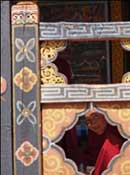 Even considering all the unusual places we have been on this trip, Bhutan has impressed me a lot. It is a strange mixture of the exotic and the familiar. The houses are all pretty much the same in architectural style. In fact, by edict, they must all mimic the monasteries that dot the countryside. They are wildly colorful, almost Mexican, and heavily carved in stylized patterns. The effect of the carving, color, and style is reminiscent of a Swiss village. (CC comment: a Swiss village with extreme chromatic exuberance.)