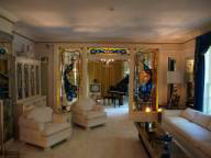 A surprise. The commercialization around the site is gaudy and ubiquitous. By the time you actually get to the façade of the house you are not ready for the understated southern-style home (he didn't build it, he bought it from a doctor). The front formal rooms are surprisingly well appointed. The home of a rich person who's decorator had taste. Actually the house is very small by today's standards. The first floor had a dining room, a kitchen, a living room, his parent's bedroom, and a rec-room. The basement was completely done as a party cum TV room. The basement and the rec-room were lavishly and gaudly decorated; carpeting on the walls and ceiling, mirrors, loud colors, wild furniture. What must have seemed fun to its owner. As I said, the house would not be what one would expect of a rich man today. Because the property consisted of 13 acres, there were several outbuildings; one a squash, exercise facility, one for horses, for cars and motorcycles, a trophy room, and ultimately, a gravesite. The home of a rich kid who could have anything he wanted.