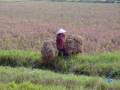Our destination today was Halong Bay, a three hour drive from Hanoi. The drive through the countryside was actually great. We got to see lots of rural life, including farmers harvesting rice (picture at right), tilling fields, and trying to keep water buffalo in line (which mainly meant off the highway). When we stopped to get some close-ups of the farmers harvesting rice, the women seemed to be doing all the work.