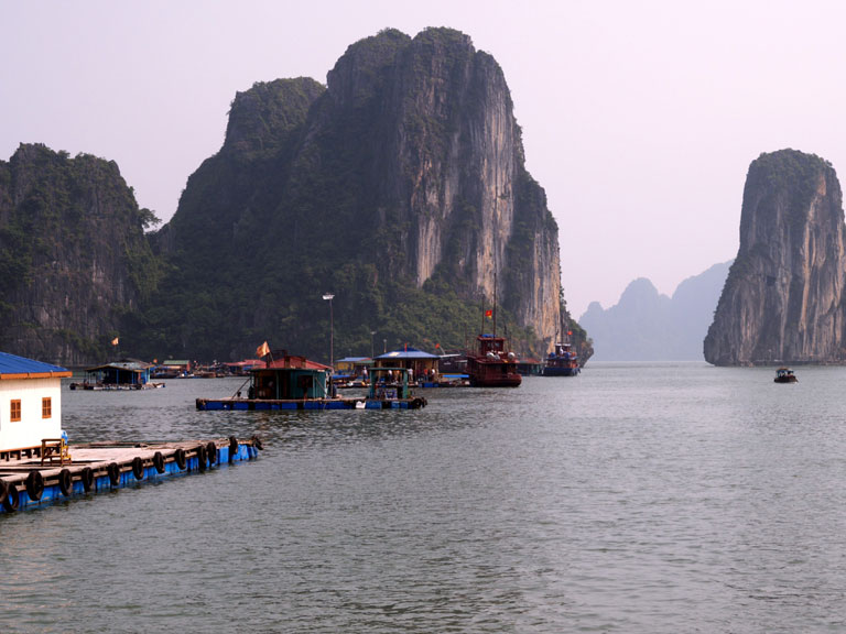 On Halong Bay, we boarded a junk where we were served one of the best lunches we've had on the trip (a variety of seafoods, noodles and veggies). The limestone cliffs in Bay were spectacular. They were not as tall as the limestone cliffs in Guilin and they were much more spread out because they were in a bay and not along a river, but at least we could see them (no fog or rain). They really were beautiful. Nestled inside the bays formed by these cliffs were floating villages that farmed fish. Cultured pearls were raised under the floating houses.
